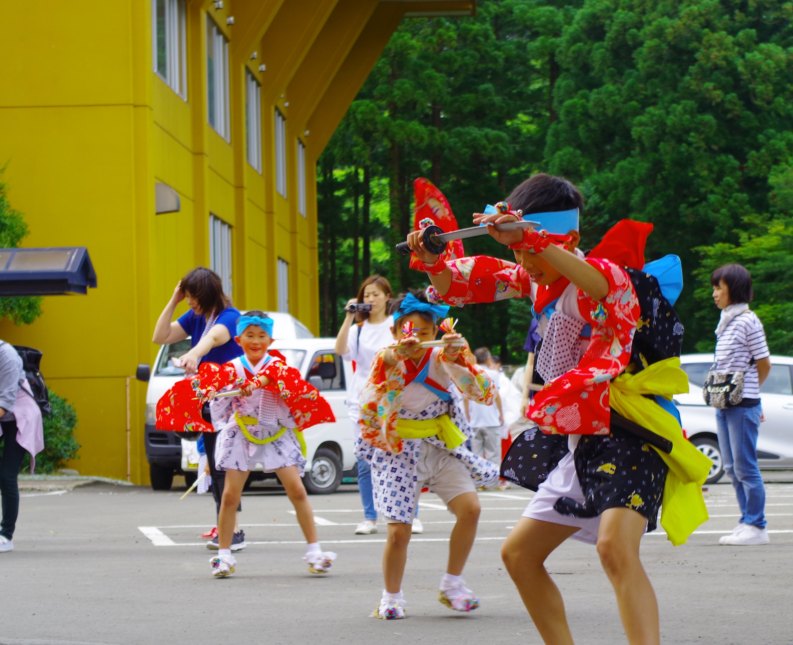 元気に「先祓舞(さきばらいまい)」を踊る湯瀬温泉祭。